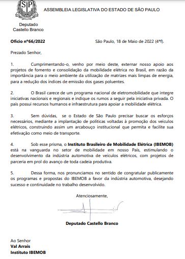 No dia 18/05 fomos agraciados pela Assembleia Legislativa de SP, pelo trabalho desenvolvido na qualificação de " Mão de obra" e projetos de mobilidade eletrica .
